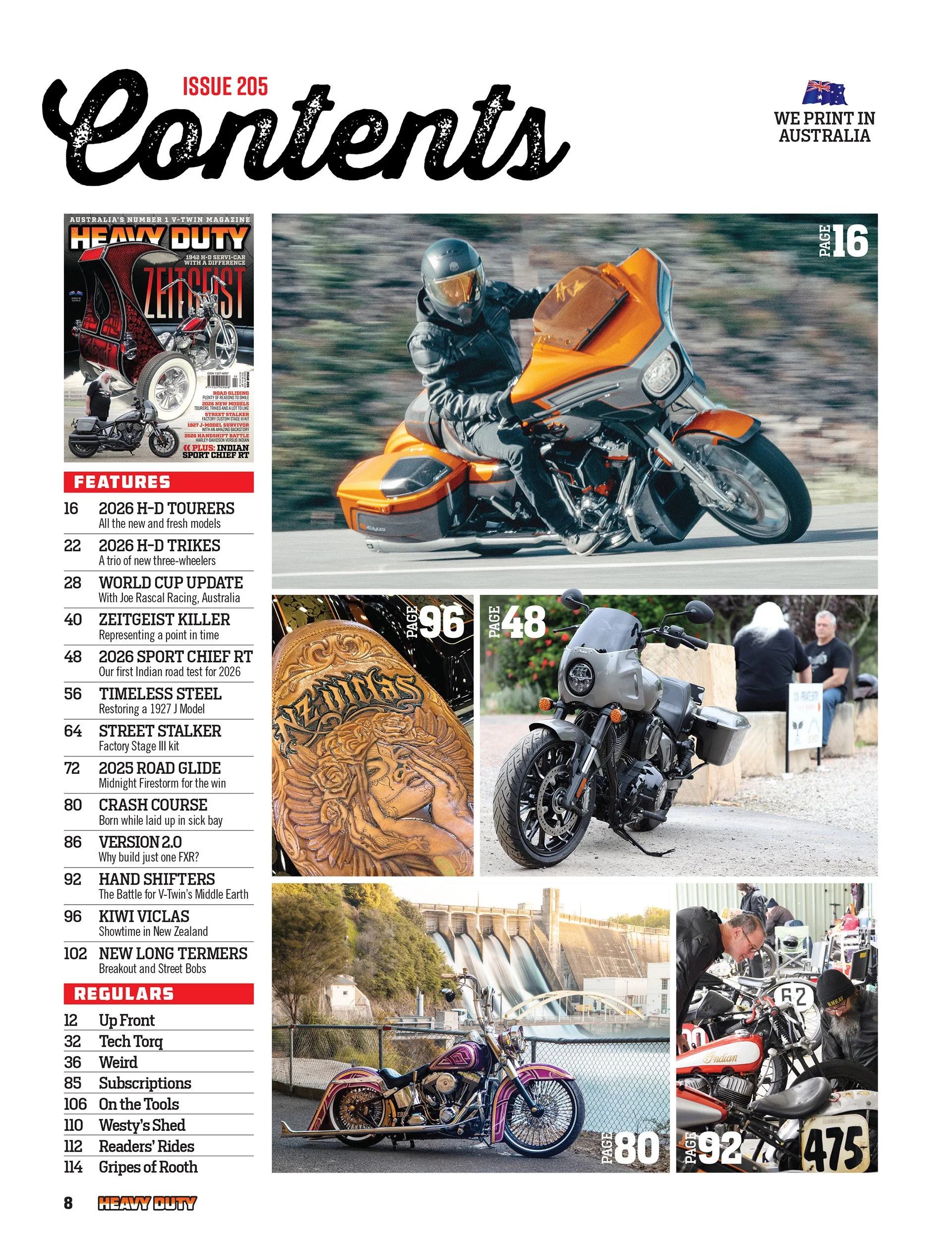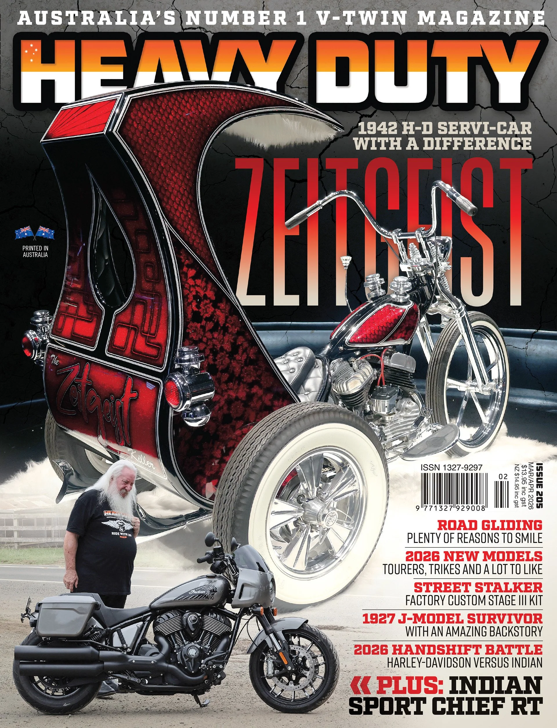 Established in 1991, HEAVY DUTY magazine is a 132-page bi-monthly motorcycle magazine featuring in-depth road tests of new Harley-Davidsons, and the occasional Triumph and Indian Motorcycle as well features on custom choppers and V-twins (both old and new) from all over Australia and around the world.