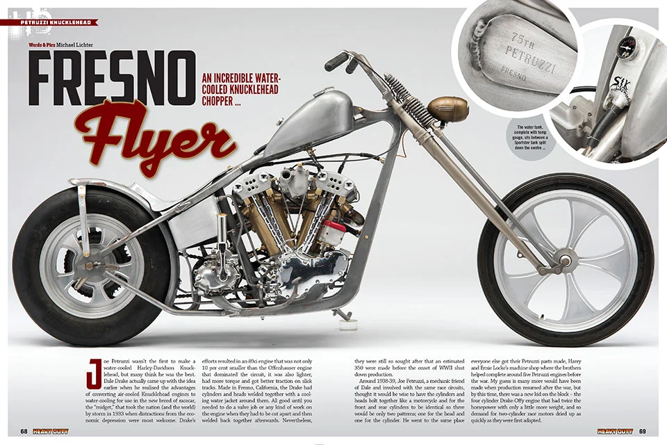 We have an update on Forty-Eight Flash, our project Sportster, and a magnificent 1965 Electra Glide Panhead on our cover. Doc fills us in on what he has done to his 1970 charity ride bike and we have a unique SoCal style chopper with a replica 1939-era water-cooled Knucklehead engine that once powered pre-war midget speed cars!